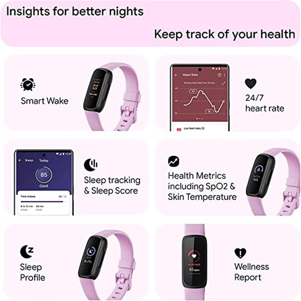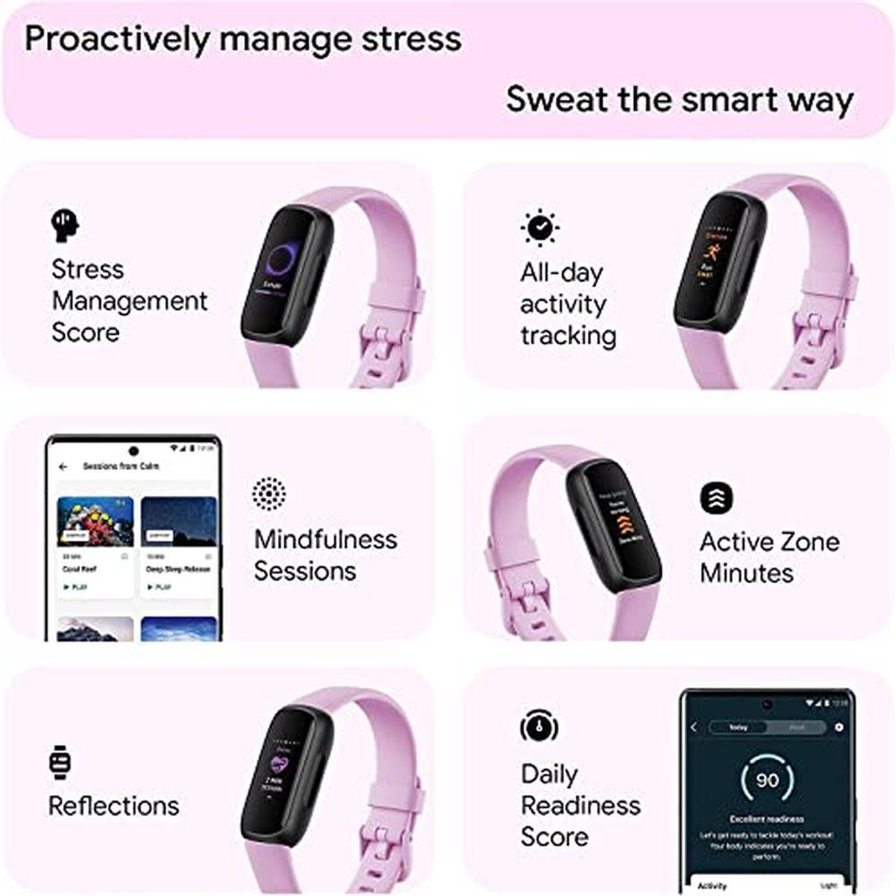 Elevate your fitness journey with the Fitbit Inspire 3, featuring daily readiness score, 24/7 heart rate, active zone minutes, cardio fitness score, connected GPS, exercise modes, and automatic exercise tracking. Monitor your health with SpO2 tracking, skin temperature variation, heart rate variability, breathing rate, wellness report, resting heart rate, and irregular heart rhythm notifications. Manage stress and sleep with stress management score, mindfulness sessions, reflections, relax breathing sessions, sleep tracking, sleep stages, sleep score, and smart wake alarm.