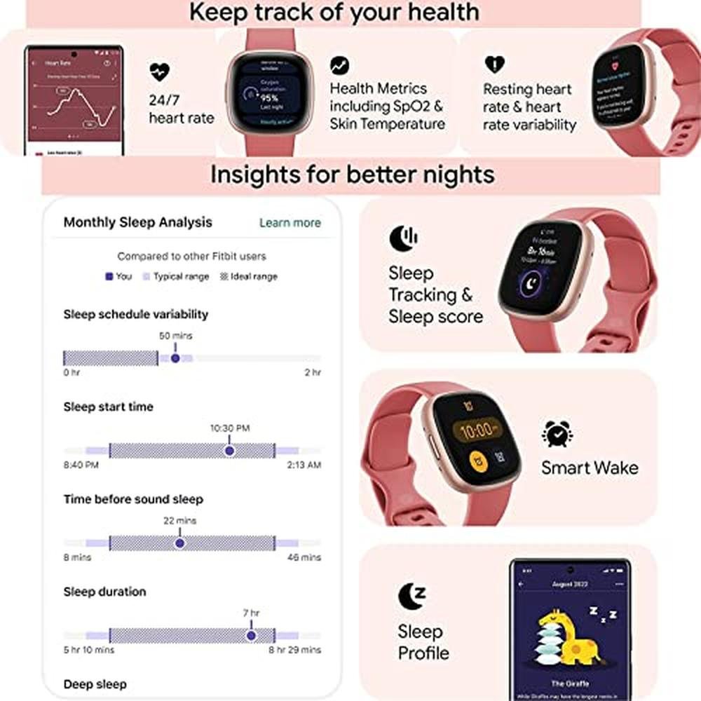 Elevate your fitness journey with the Fitbit Versa 4, featuring heart rate tracking, Active Zone Minutes, built-in GPS, and a Cardio Fitness Score. Monitor your health with SpO2 (blood oxygen) tracking, resting heart rate, high & low heart rate notifications, and more. Plus, track your sleep, stress, and mindfulness with features like sleep tracking, sleep stages, and relaxation sessions. With Fitbit Premium membership, you'll have access to personalized insights and guidance to help you reach your goals.