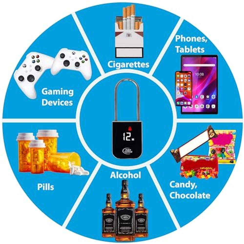 Unlock a healthier you with our innovative Habit Control Metal Timer Lock, expertly crafted to help you establish and maintain positive habits. This advanced smart padlock for kitchen cabinets, timed out keyless pad lock, and electronic time locking lock for cell phones, snacks, liquor, game consoles, and other unwanted temptations is the ultimate solution for those seeking to lock in healthy habits and lock out distractions. By setting a timer for your desired time limit, you can create a sense of accountability and motivation to stay on course, whether you're trying to reduce screen time, limit snacking, or develop a new routine. Say goodbye to the cycle of bad habits and hello to a more disciplined you.