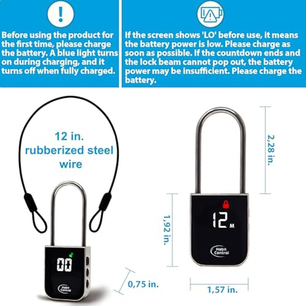 Our time release lock, made from high-quality metal, prioritizes strength, safety, and safeguarding your belongings. Its sleek design features a smooth surface and rounded edges, delivering both durability and a satisfying tactile experience. Habit Control timed lock sets a new standard with an easy-to-use HD LED LCD display and three user-friendly buttons. While many time locks are limited to hours and minutes, our upgraded model empowers you to set timers in days for unmatched flexibility. Once the timer elapses, the timelock unlocks automatically. Electronic Timer Padlock excels in power efficiency, ensuring prolonged standby time. High security timerlock houses a rechargeable 110mAh lithium battery, offering up to 500 hours of standby time on a single full charge (Type-C cable included). This lockable timeout pad lock box is perfect for breaking addictive habits, whether it's securing smartphones, gaming consoles, medicines, medication, cigarettes, toys, snacks, or beverages. It finds applications in various settings such as the kitchen cabinets, school & gym lockers, fostering self-discipline with ease.