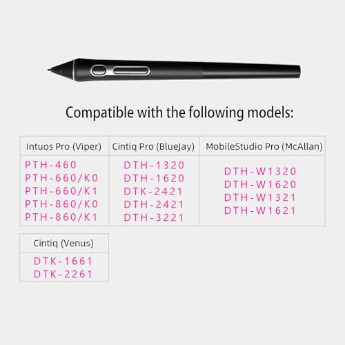 Compatibility for Intuos Pro PTH460, PTH660, PTH660P, PTH860, PTH860P, Cintiq Pro 13 and 16 DTH1320, DTH1620, Cintiq Pro 24, DTK2420, DTH2420, Cintiq Pro 32, DTH3220, and MobileStudio Pro DTHW1320, DTHW1321, DTHW1620, DTHW1621H, Cintiq 16 DTK-1660, Cintiq 22 DTK-2260.