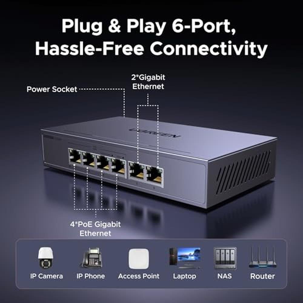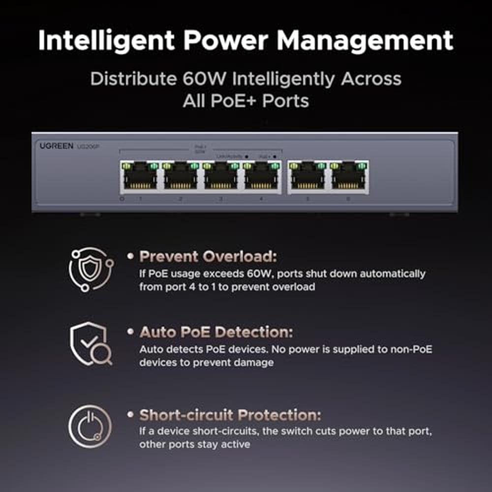 • More Ports, PoE Ready: UGREEN ethernet switch offers 4 PoE+ (802.3at/af) Gigabit ports (up to 30W each) and 2 Gigabit uplink ports, with a total power budget of 60W. Ideal for efficient power delivery and seamless network connectivity
