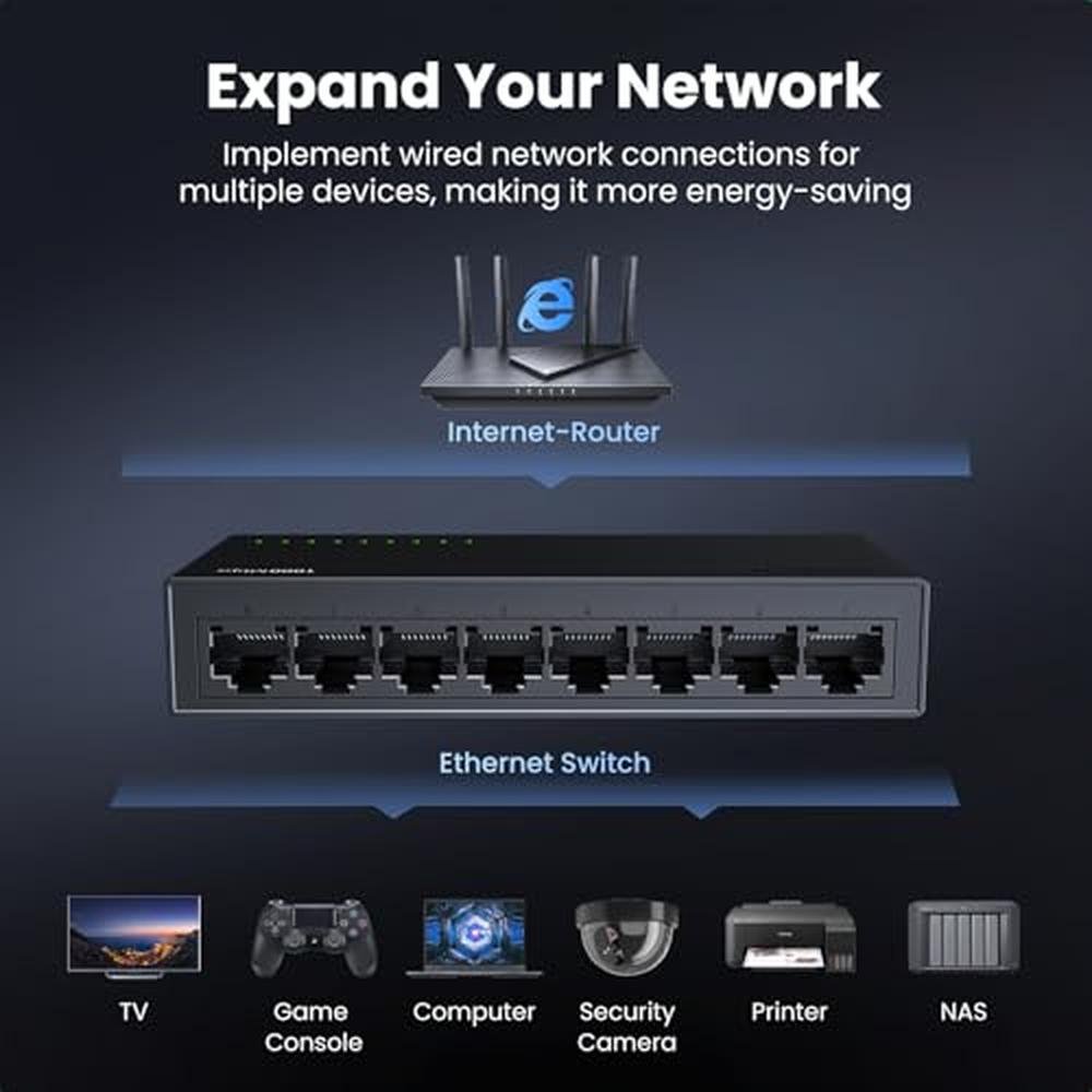 UGREEN Ethernet Switch, 8 Port Gigabit Ethernet Splitter, Plug & Play, Wall Mount & Desktop Network Switch Hub, Unmanaged, Compact, with LED, Fanless Quiet, for Internet Cable, Laptop, Router, NAS