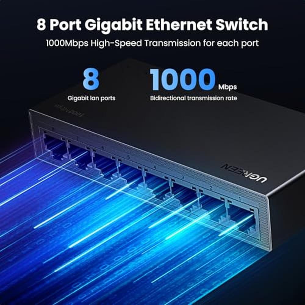 UGREEN Ethernet Switch, 8 Port Gigabit Ethernet Splitter, Plug & Play, Wall Mount & Desktop Ethernet Hub, Unmanaged, Compact, with LED, Fanless Quiet, for Ethernet Cable, Laptop, Router, NAS