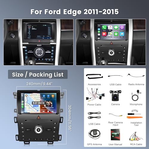 2+64G Android Car Stereo for Ford Edge 2011-2015 with Wireless Carplay Android Auto Car Radio, 9'' Touch Screen Head Unit Mirror Link WiFi GPS Navigation Blutooth FM/RDS EQ AHD Rear Camera SWC