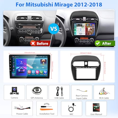 2G+64G Car Radio for Mitsubishi Mirage 2012-2016, Rimoody Car Stereo with Android 13 Wireless CarPlay Android Auto Mirror Link GPS WiFi 9 Inch Touch Screen Bluetooth FM/RDS SWC Camera