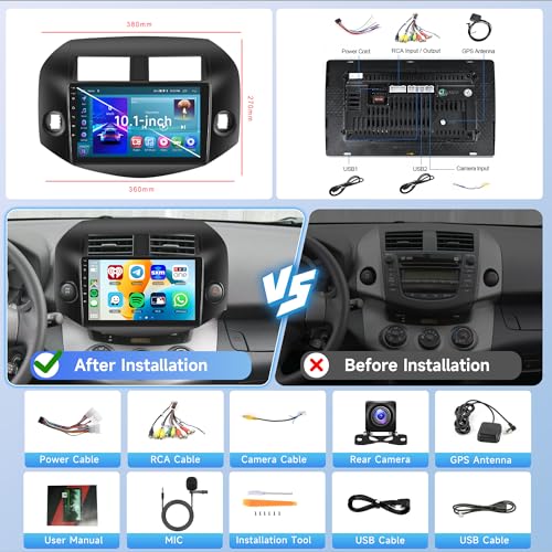 2G+64G Car Radio Screen for Toyota RAV4 2007 2008 2009 2010 2011, Rimoody Android Car Stereo Carplay Andorid auto 10.1 inch Touch Screen GPS WiFi Mirror Link EQ Bluetooth FM + Backup Camera