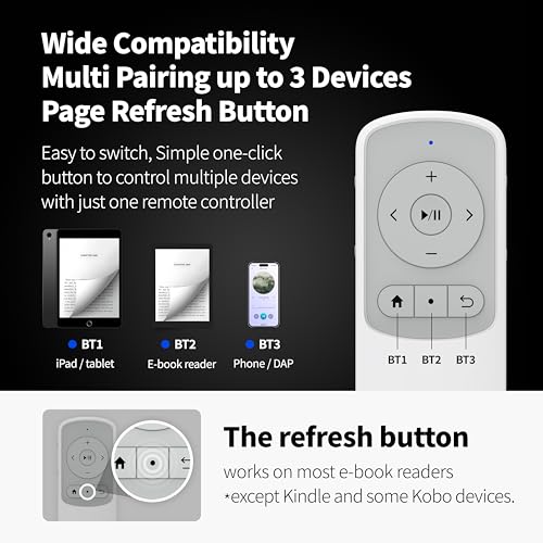 • Remote Page Turner for Bluetooth e-Reader With Remote Page Turner, you no longer need to touch the screen to turn ebook pages. This hands-free e-book Page Turner lets you completely immerse yourself in reading comfortably. This remote controller also has a Page Refresh button to provide a clean reading screen. ( All operations may vary depending on the device manufacturer or the specific App.) ( This remote control is Not compatible with Kindle Paperwhite, Oasis, Colorsoft, Scribe, Voyage) (This remote works well with Kindle application on iPad, iPhone, Galaxy, and Andorid OS tablets phones)
