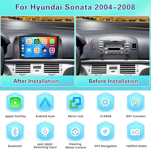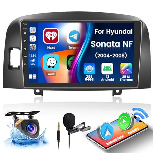 FulukuA, 2+64G for Hyundai Sonata 2004-2008 Android 13 Car Stereo with Wireless CarPlay Android Auto Mirror Link, 9 Touchscreen Radio WiFi/GPS/FM/RDS/Bluetooth/SWC/Waterproof Night Backup Cam Mic