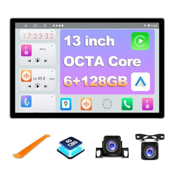 JMANCE 13-inch 1920x1200 QLED Double Din Android Octa Core Stereo is a top - tier car audio and navigation solution. Powered by an Octa Core CPU, it comes with 6GB RAM and 128GB ROM, ensuring a swift and seamless user experience. The large 13 - inch touch screen features QLED technology with a high resolution of 1920*1200. It easily connects to your phone's WIFI or hotspot, allowing you to download apps from the Android Market, enabling you to surf the web and access platforms like Twitter, YouTube, and Facebook. It showcases a unique 3D interface and 5 special UI displays. With a simple click, you can switch apps to a 3D sphere display, and the app's surrounding area will transform to display one of 12 planets, offering a stunning visual treat. This stereo is equipped with free 1080p AHD wide - angle waterproof front and rear cameras, supporting dual - camera recording and allowing you to set single or dual - camera image display on the screen for safer driving. It supports Wired/Wireless Carplay, Android Auto, Siri Voice Control, and G Assistant. Integrated with advanced DSP technology and a 32 Equalizer, it enables individual adjustment of 4 speakers, creating a concert - like sound. Additionally, it supports steering wheel control, AM/FM/RDS radio, has a cooling fan, adjustable EQ band, split - screen function, and customizable brightness, volume, and language. It comes with lifetime technical support. Note: While it can fit various cars with different frames, some vehicle models may lack a dedicated frame, making installation unfeasible. Please contact us before purchasing..