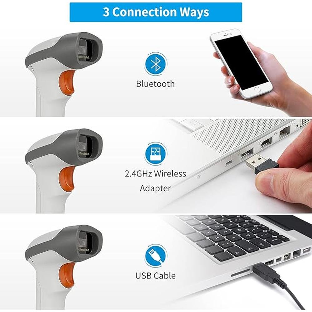 - 3-in-1 WirelessWired Connection 2000mAh Battery - NetumScan scanner can work via 2.4Ghz wireless USB 2.0 wired. It is compatible with Bluetooth as well. Large 2000mAh built-in battery, standby time is as long as 60 days, which allow you to scan bar code in every corner of your library and warehouse. Also, it can scan barcodes with a USB cable which will charge the scanner gun at the same time. Dont need driver.