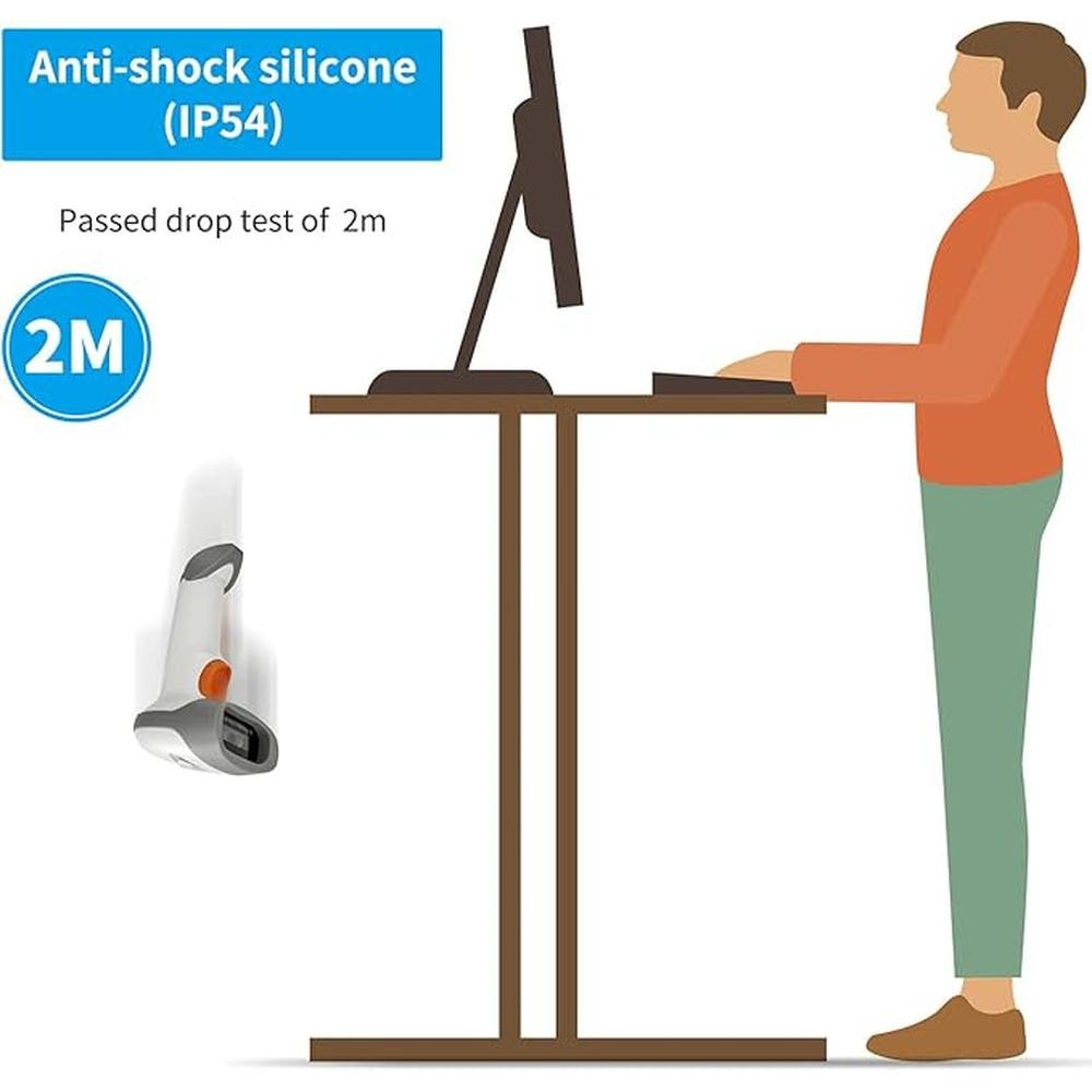 - Professional Anti-Shock Design - Made of great ABSPC materials,high shock-resistant, and the silicone protective cover can avoid the scratches and friction while falling from the height of 6.57 feet the technical of IP54 sturdy which protect the wireless barcode scanner from dust and moisture.