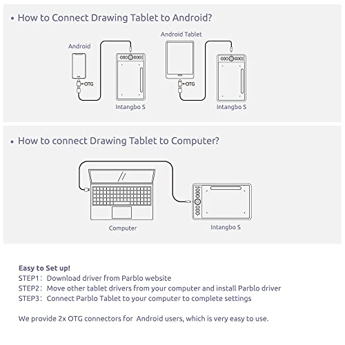 Experience the ultimate in digital art creation with the Parblo Intangbo S Graphics Drawing Tablet, featuring a 7 x 4 inches drawing area, 8192 levels of pen pressure, and tilt support. This high-end drawing pad is compatible with Mac, Windows, and Android devices, and works seamlessly with major graphics software such as Adobe Photoshop, Illustrator, and more.