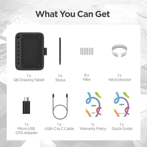 This high-end drawing tablet is compatible with a wide range of systems, including Android, Linux, Mac, Windows, and Chrome OS, and works with popular creative software like Photoshop, Illustrator, and more. With its superb compatibility and advanced features, the UGEE Q6 is the perfect choice for artists, designers, and professionals looking for a premium drawing experience.