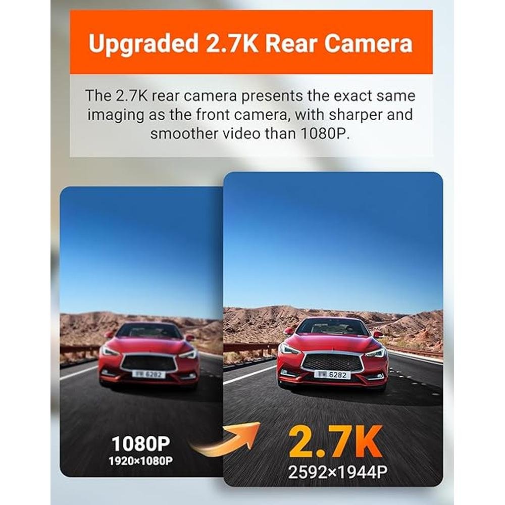 - 2.7K Upgraded Rear Camera The E2 dash camera is innovatively equipped with a high-resolution rear camera of up to 2.7K(25921944P), giving you full driving safety protection not only from the front but also from the back. You will get clear 2.7K instead of the normal 1080p rear-end recording video evidence to protect you from false claims in the event of a rear-end collision.