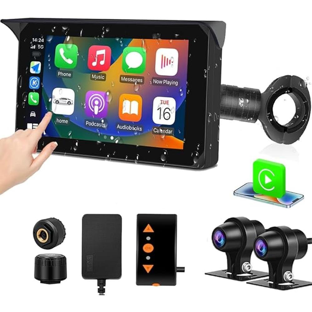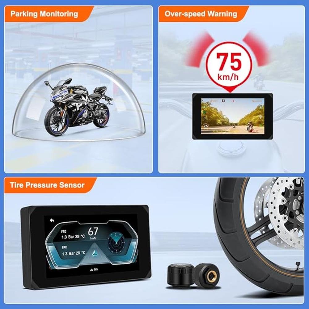 VSYSTO Wireless Carplay Motorcycle Dash Camera with 5" Touchscreen, GPS Navigation, WiFi 1080P SONYIMX307 Front and Rear Camera, Parking Monitoring, Tire Pressure Sensors, Temperature Display(CS5 Pro)