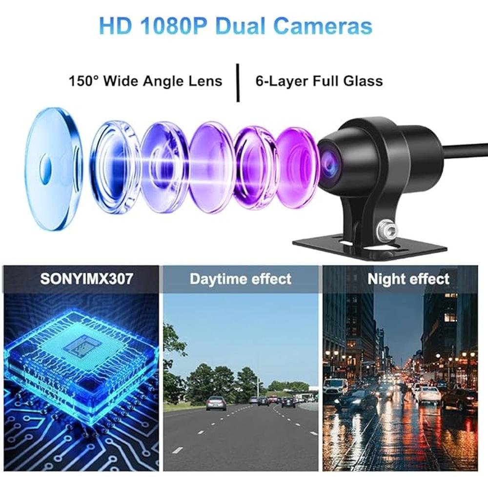 - 1080P HD Cameras 140 wide lens, SONYIMX307 sensor, 1080P front rear record at same time. Enhances safety with clear video. Advanced WDR captures more light for sharp videos even in low light. Enjoy high-quality images.