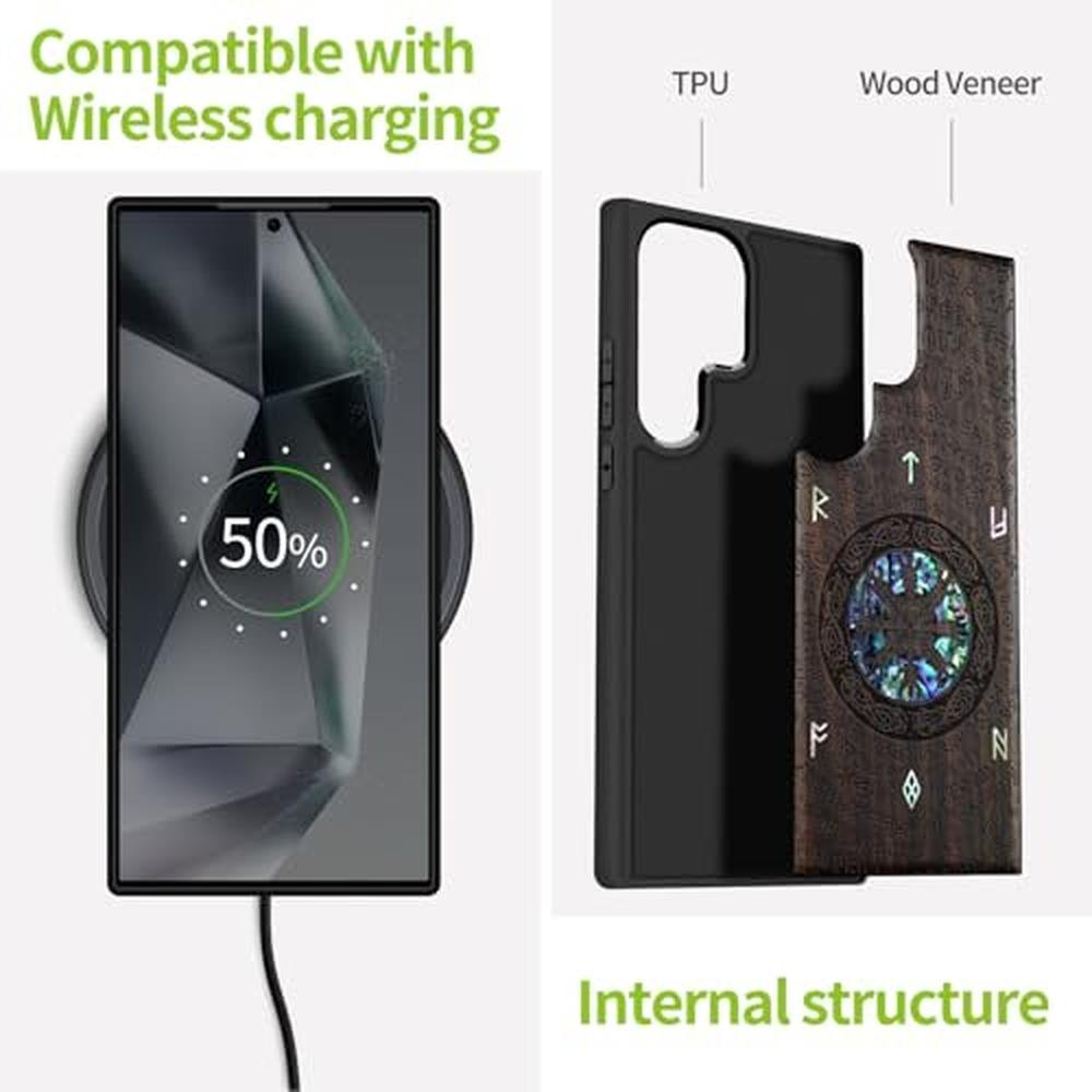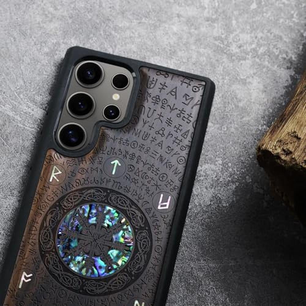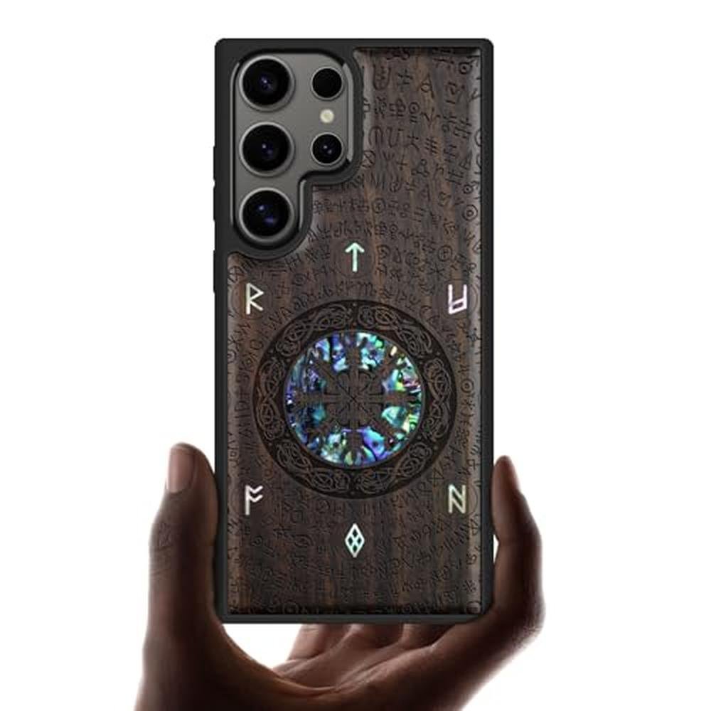 Carveit Designer Wooden Case for Samsung Galaxy S25 Ultra Case [Wood Engraving & Shell Inlay] Compatible with Wireless Chargers S25 Ultra (Viking-Blackwood)