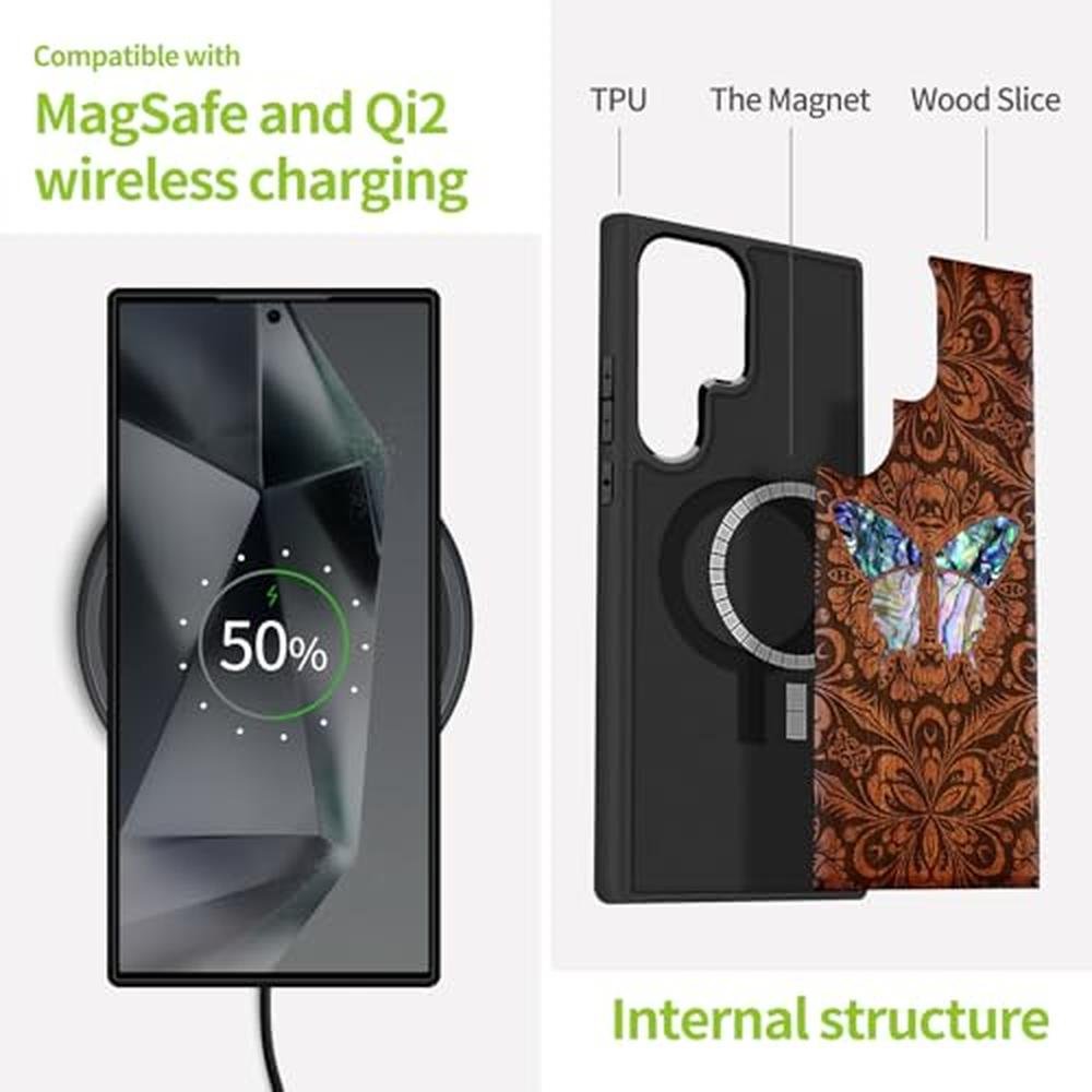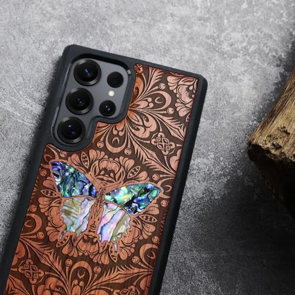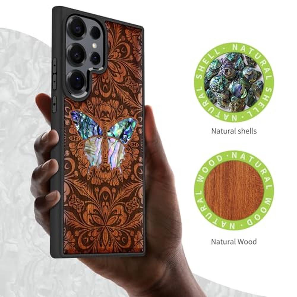Carveit Magnetic Wooden Case for Samsung Galaxy S25 Ultra Case, Wood Artisan Engraved & Handmade Shell Inlaid, Compatible with MagSafe Wireless Chargers (Baroque Butterfly) Rosy