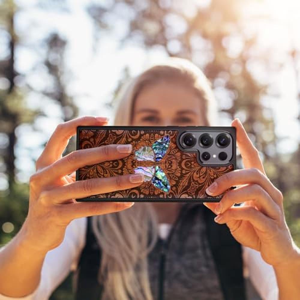 - [Product composition]This wooden phone case is both lightweight and protective. It is composed of natural wood and a high-quality soft TPU (Thermoplastic TPU) backing that is both beautiful and protective. The original wood panel demonstrates its uniqueness, and its surface sequins are crafted from natural Mother of pearl ( Paua shells ), which are hand-set into place, Once you receive the product, you will be able to appreciate its individual and natural beauty.