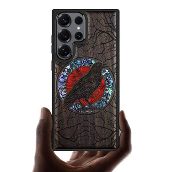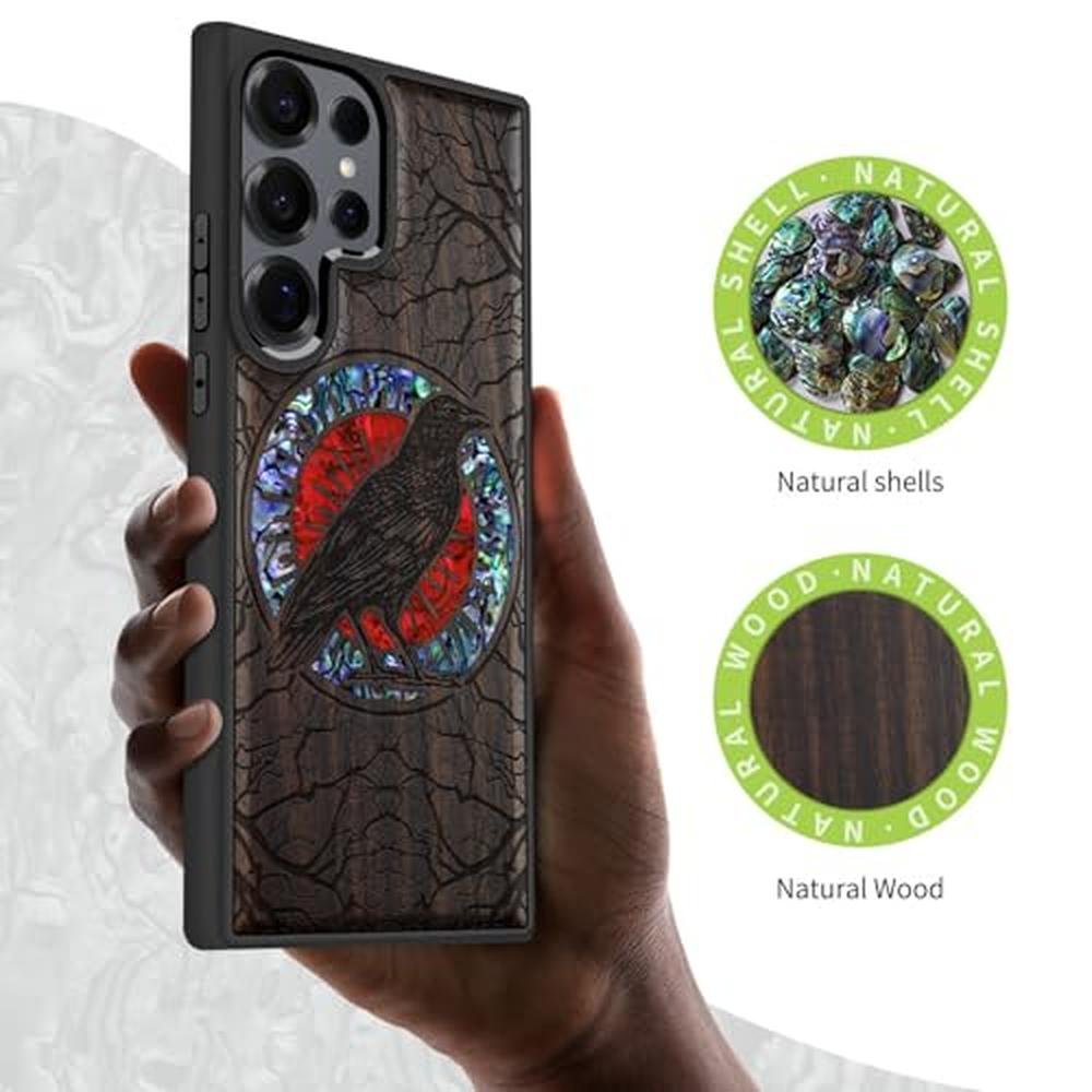 Carveit Magnetic Wooden Case for Samsung Galaxy S25 Ultra Case, Wood Artisan Engraved & Handmade Shell Inlaid, Compatible with MagSafe Wireless Chargers (The Haloed Crow) Blackwood