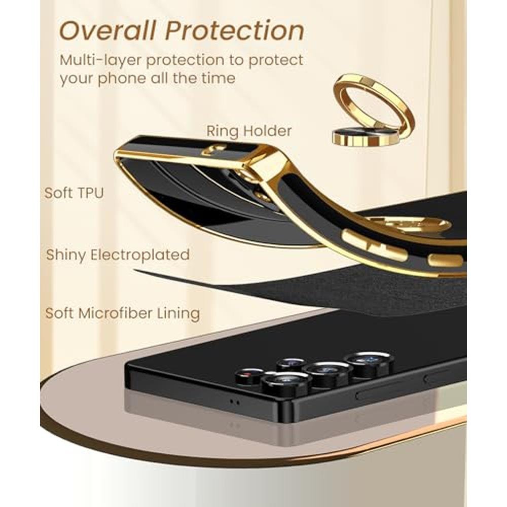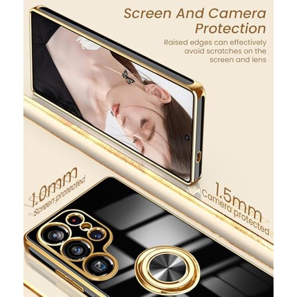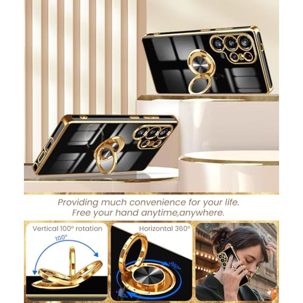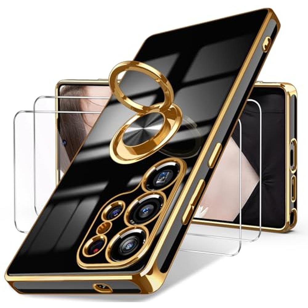 Dretal for Samsung Galaxy S25 Ultra 5G Case, 2X Screen Protector, 360Rotatable Ring Holder Magnetic Kickstand,Plated Gold Edge Slim Soft TPU Protective Phone Cover for Galaxy S25 Ultra (Black)