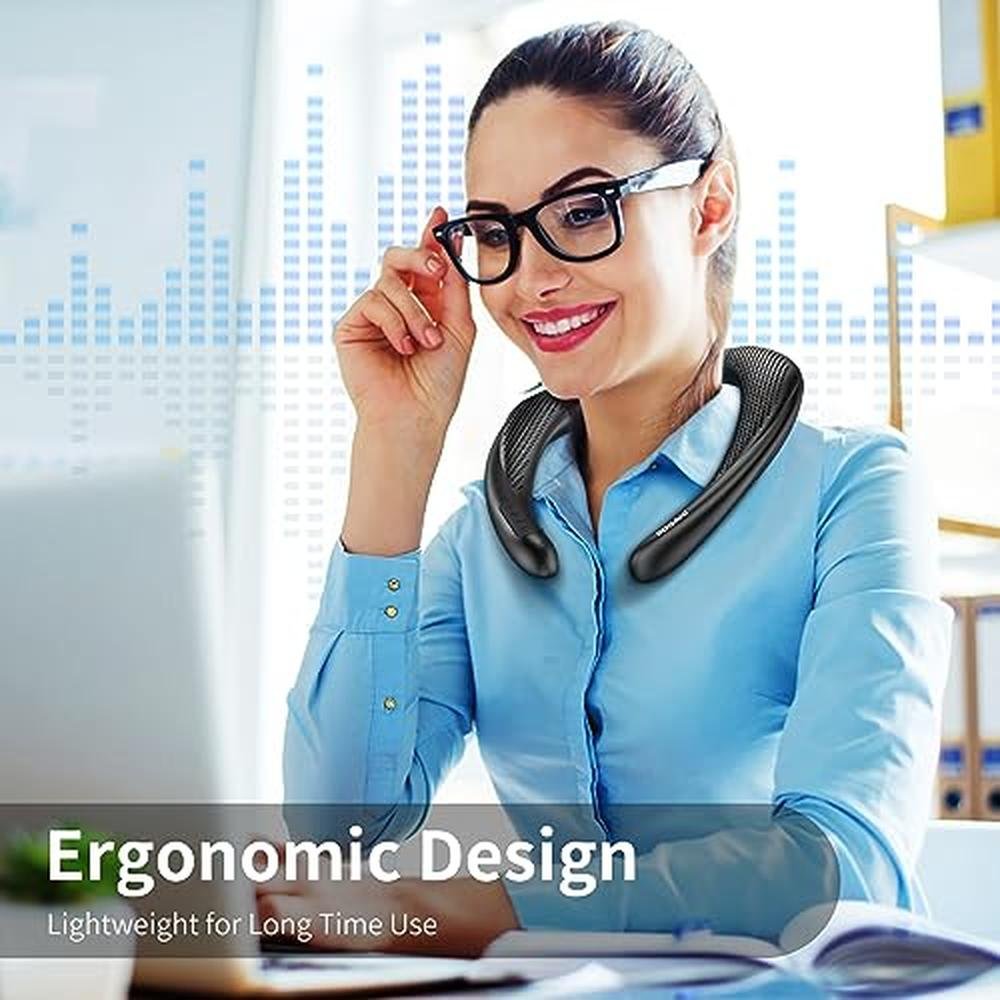 • True 3D Theater-Stereo Sound-- Built-in 3W*2 speakers system, the wireless neck speaker produces rich sound and an enhanced bass that goes far beyond its size. Upward-facing speakers on both sides of the neck speaker produce high-quality 3D theater sound surrounding your ears to create a truly unique and immersive sound experience.
