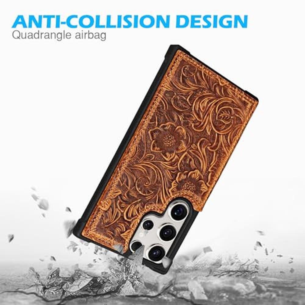The cowhide is embossed with Tang grass patterns, giving it a firm touch, a strong texture and a classical and beautiful appearance. It is not soft. The four corners of the phone case are equipped with airbag anti-collision designs, which can provide effective protection when the phone drops or colliding. Regarding the card slot, when the new product comes out, it will be a little tight when inserting a card for use. However, as time goes by, it will become increasingly easy.