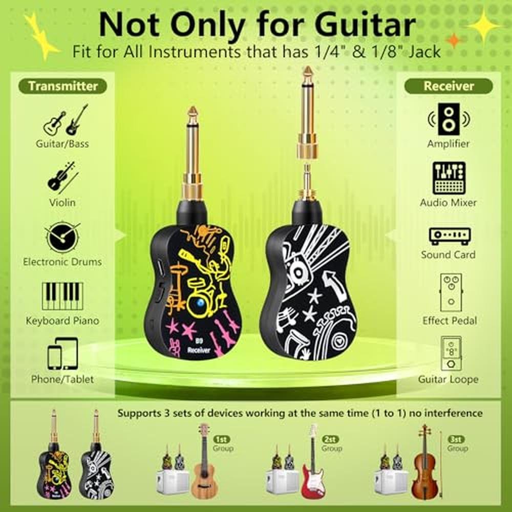 - Upgrade 2 in 1 Plug, High Compatibility----B9 wireless guitar transmitter with 6.35mm and 3.5mm plug, freely switch, bluetooth guitar transmitter support more electric musical instruments, compatible for most electric guitars, bass, violin, apm, pedal board, acoustic guitars and other digital music instruments, the device are approved for worldwide use