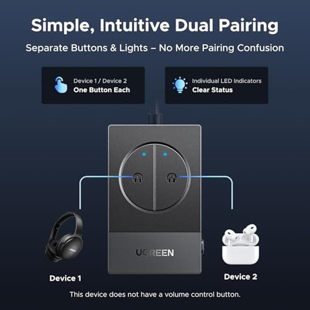 UGREEN Airplane Bluetooth 5.4 Adapter for 2 Airpods or Headphones, Wireless Bluetooth Transmitter Compatible with All AirPods Like Airpods 4/Pro2/Max,Dual 3.5MM AUX Jack Adapter Included