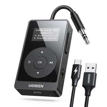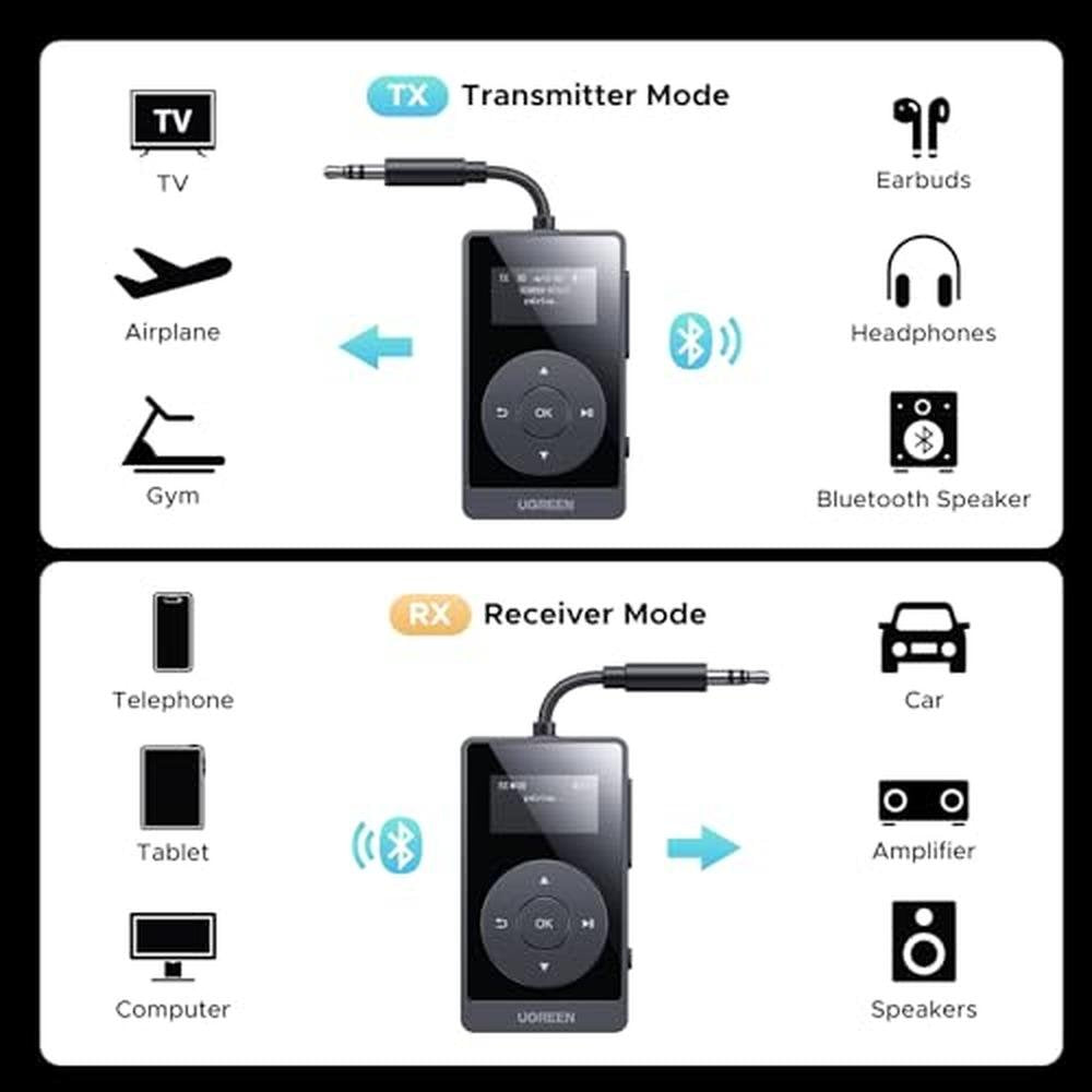 2 In 1 Bluetooth Transmitter Receiver: In TX mode, you can connect the device to an airplane, TV, and other devices without Bluetooth function, and then connect Bluetooth headphones to listen to music; in RX mode, you can turn non-Bluetooth stereo devices such as car audio, old speakers into Bluetooth devices, and then connect mobile phones, computers, etc. to play music; without the constraints of cables, move more freely without affecting audio playback. Aptx sounds quality improvement: The adapter uses advanced Aptx technology to reduce audio delay significantly, and make the music details richer, bringing a better audio-visual experience whether watching videos or playing games. Maximum 32 Hours Battery: It can last up to 32 hours to meet your all-day use needs. This device is the best companion whether you frequently travel for leisure or business trips. You can enjoy uninterrupted music or calls without frequent charging.(RX: 32H/ TX: 28H ) LED display: With the LED display, The adapter can display the connection status, device name, and other information, making the user more intuitive during use and reducing the difficulty of pairing and connection, thus improving the overall user experience. Built-in Microphone: The built-in microphone of the ugreen allows you to answer calls directly without interrupting music playback when the device is connected to a mobile phone to play music; ugreen ensures that you do not miss any important calls while enjoying music. 10M Transmission Distance: The 10-meter transmission distance allows you to move freely within your home or office without worrying about interruptions in the audio signal. No matter where you are in the room, you can enjoy stable audio transmission.