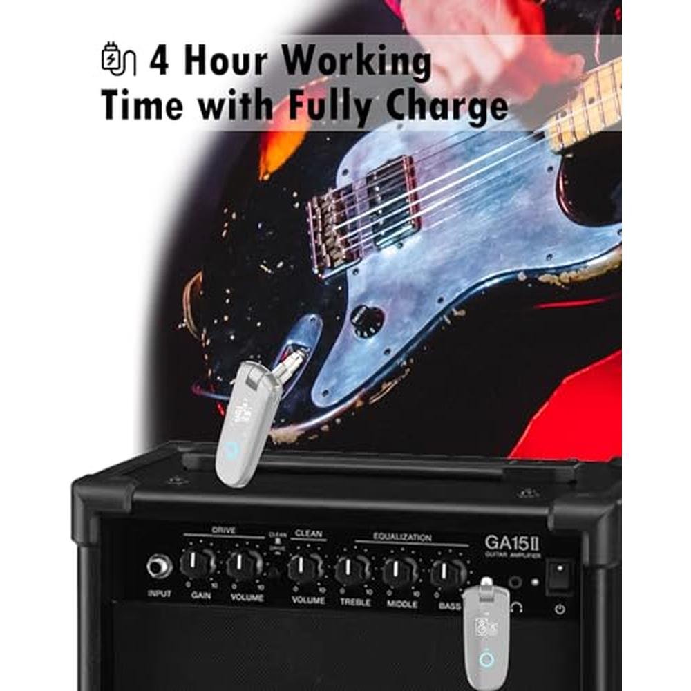 - Durable Rechargeable Battery Both the wireless guitar transmitter and receiver are equipped with built-in rechargeable lithium batteries. Enjoy over 4 hours of operation (circumstancial) on a full charge. The package includes a dual-ended USB cable for convenient recharging.