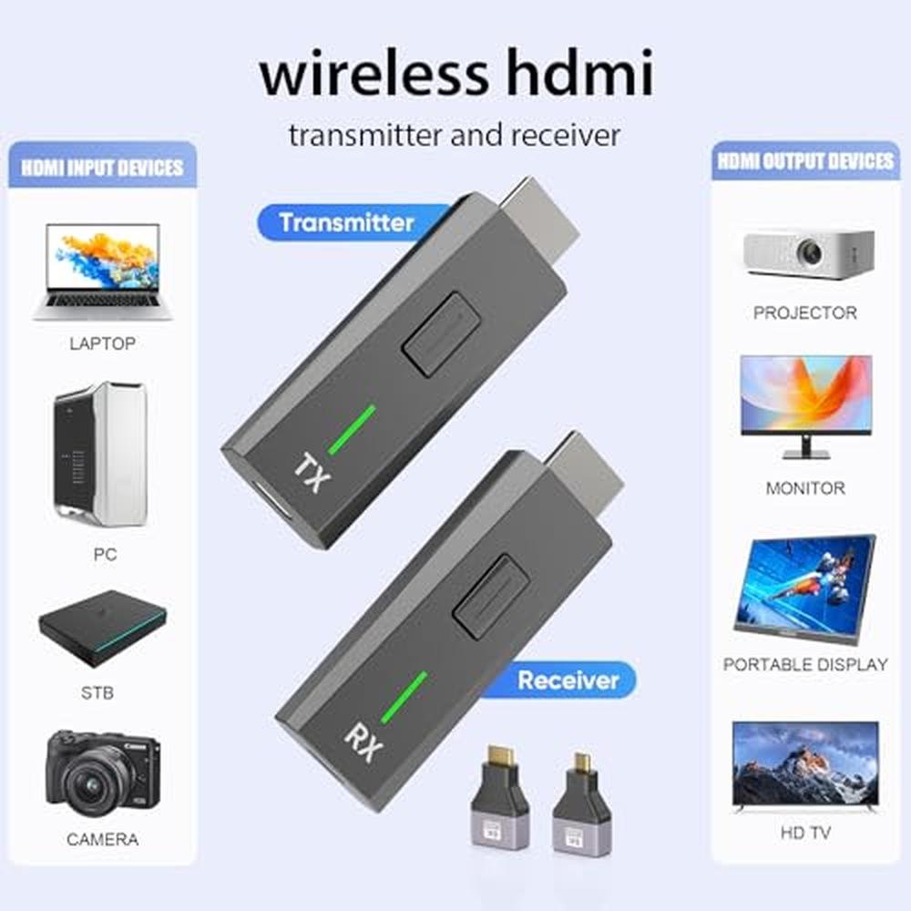 Immerse yourself in crystal-clear wireless display connectivity with this versatile HDMI transmitter and receiver kit. Supporting exquisite 4K decode and 1080p output, this plug-and-play solution eliminates the hassle of messy cables while maintaining high-quality video and audio transmission. The dual-band 2.4G/5G wireless technology ensures stable performance and minimal latency. Perfect for both home and professional settings, this HDMI extender kit easily connects your laptop, PC, TV box, or camera to various display devices including monitors, TVs, projectors, and portable displays. The sleek, compact design features clear TX (transmitter) and RX (receiver) labeling with status indicators for intuitive operation. Ideal for presentations, gaming, home entertainment, or extending your workspace, this wireless HDMI kit offers the flexibility to stream content without the constraints of physical cables. The included adapters ensure broad compatibility with your existing devices, making it a practical solution for modern display needs.
