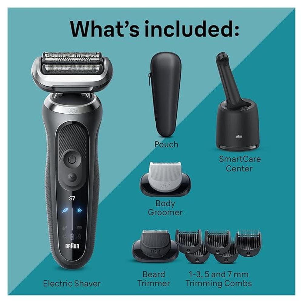 The Braun Series 7 7177cc electric shaver for men delivers a close shave, faster thanks to the floating 360 Flex Head that adapts to your contours for an extremely close shave, even in tricky areas. To easily customize your shave, select Turbo mode for an extra fast shave, Gentle mode for a gentle shave on sensitive skin, or Standard mode for a balanced shave. Easily upgrade your shaver with different attachments for all your grooming needs. Includes a SmartCare center for a shaver like new, every day. Made to adapt to your shaving needs, this waterproof electric shaver features AutoSense technology that adjusts power to your beard density. The men's shaver is made in Germany for guaranteed quality. Box includes 1x Series 7 shaver, SmartCare Center, Pouch, Body Groomer and Beard Trimmer with attachments