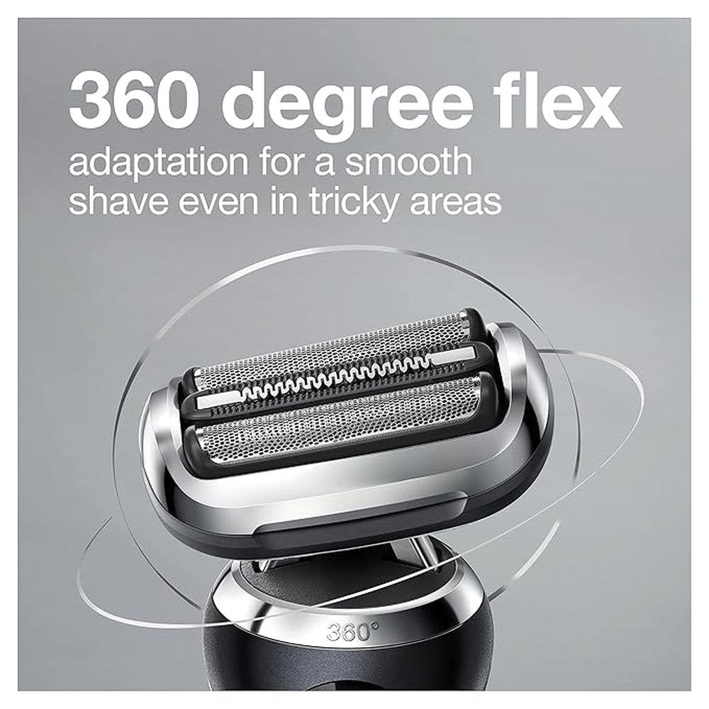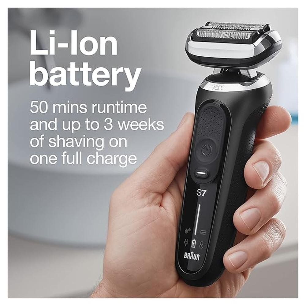Experience the pinnacle of shaving technology with the Braun Series 7 Flex electric shaver for men, featuring 360 degrees adaptation for a smooth shave. The Li-Ion Battery provides up to 3 weeks of shaving and a 5-minute quick charge, ensuring you're always ready. This men's electric razor is 100% waterproof, perfect for wet and dry use. The package includes a 4-in-1 SmartCare center, a Beard Trimmer attachment, a travel case, a smart plug for automatic 100-240 voltage adjustment, and a cleaning brush.