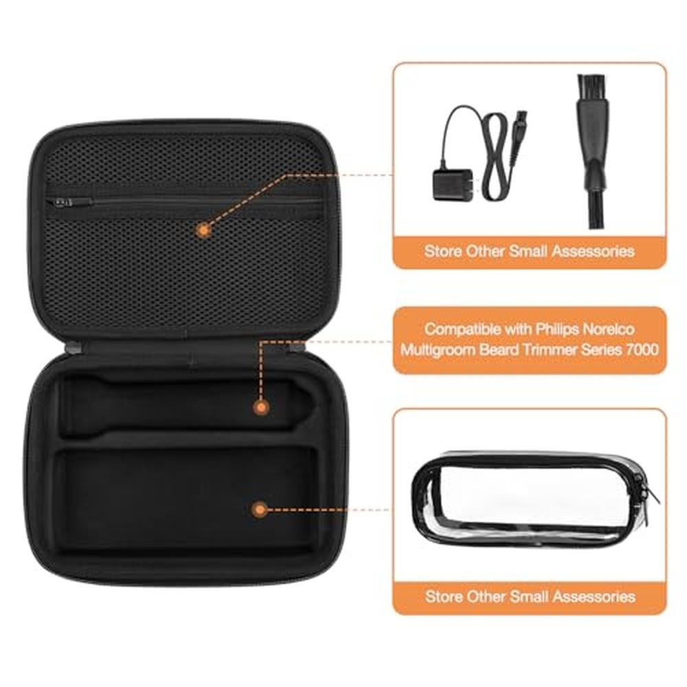This EVA hard travel case is designed to be compatible with philips norelco multigroom series 7000 MG7750/49 MG7770 MG7790 MG7791/40. A mesh pouch and a PVC bag inside will be convenient for you to store your small accessories, such as USB cable and beard trimmer attachments. Compact design with handle makes it easier to carry. Suitable for short trip, travel, camping and so on.