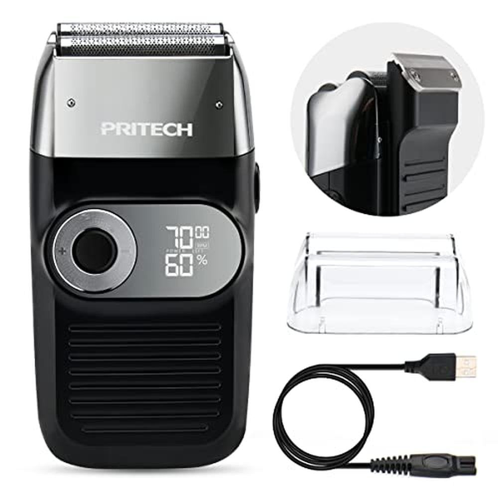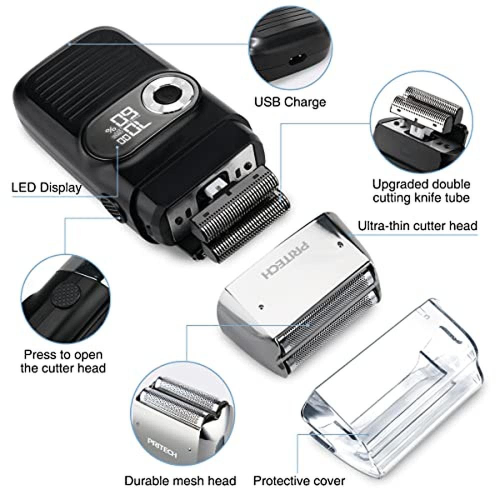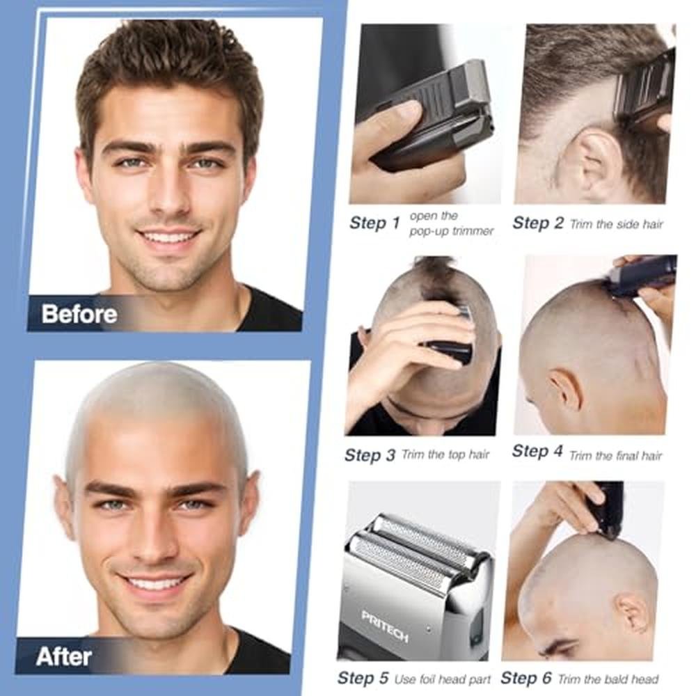 • 2-IN-1 FOIL RAZOR BALD SHAVER Pritech electric Foil and Bald shaver comes with beard trimmer and hair bald clipper.To meet your shaving needs, it can also meet your styling needs. First use a pop trimmer to shave the hair short, and then combine it with the use of a foil razor head for better results.