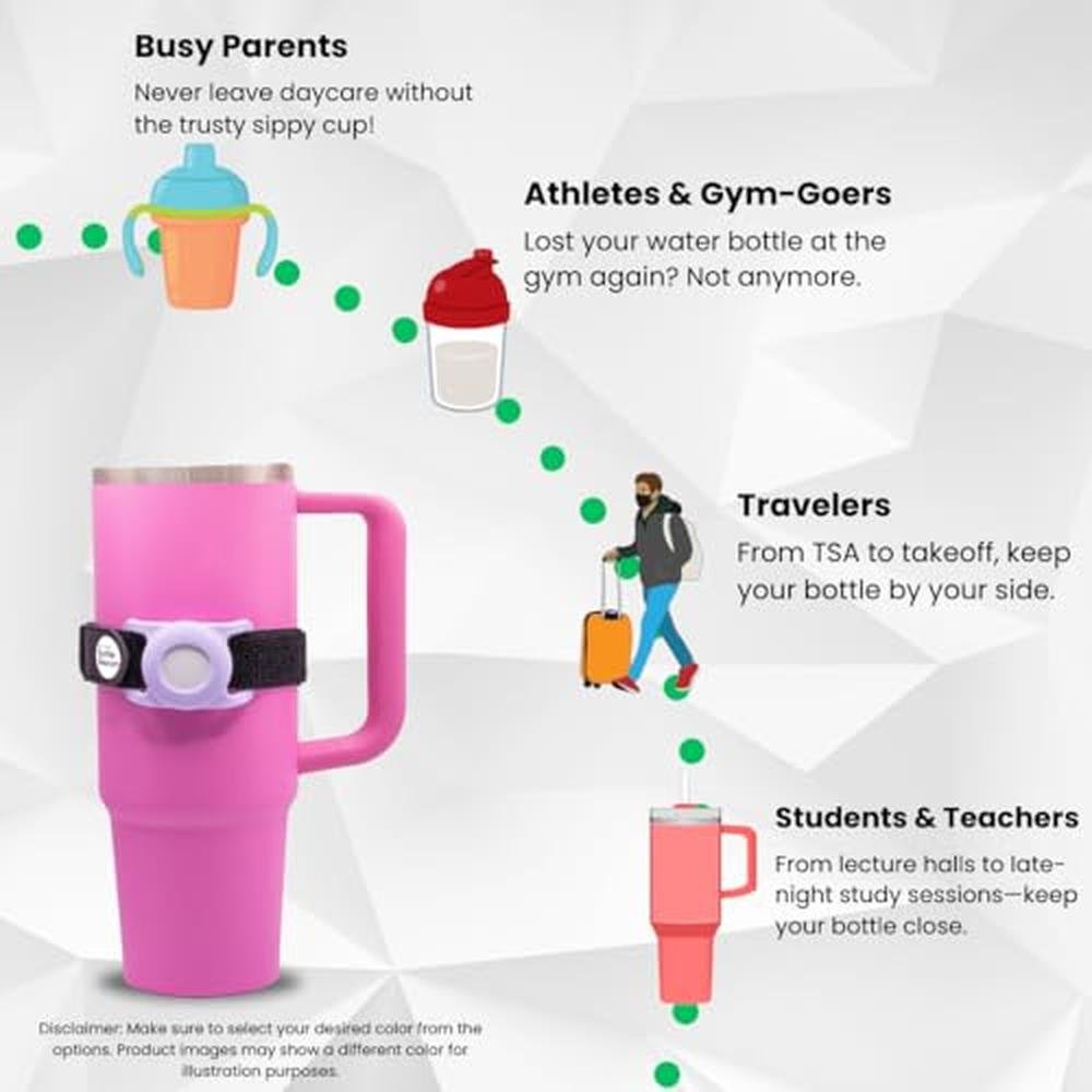 Immerse yourself in the world of Bottle Beacon, the revolutionary solution for keeping your water bottle always within reach, now elevated with enhanced versatility for every escapade. Tailored to cater to active lifestyles, it boasts a flexible strap adorned with a detachable Velcro design, ensuring a flawless fit for bottles and mugs of all shapes and sizes, even those with closed handles. The integrated silicone holder is meticulously crafted to securely cradle a small tracking device (sold separately), enabling you to keep tabs on your drinkware wherever your journey may lead. With its sleek aesthetic and vibrant color palette, Bottle Beacon embodies the perfect synergy of form and function. Whether you're navigating the urban jungle, trekking through trails, or simply staying hydrated at your desk, Bottle Beacon adapts effortlessly to your daily routine. Say goodbye to the inconvenience of misplaced bottles and hello to a smarter, more sustainable way to stay connected to what truly matters.