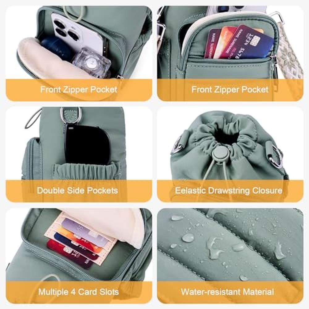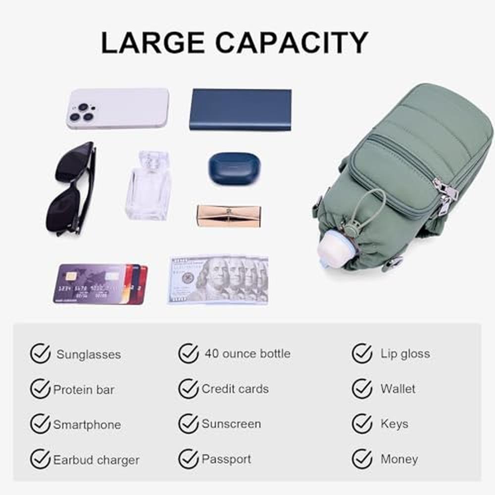 Indulge in the perfect blend of style and functionality with this crossbody water bottle bag, featuring a zippered front pocket that fits large smartphones and includes four RFID card slots to keep your essentials safe. Side pockets offer extra room for sunglasses, snacks, or sanitizer, perfect for day trips or daily use. The wide, adjustable strap offers a customizable fit for all body types, ensuring long-wear comfort without digging into your shoulder. Whether worn crossbody or over the shoulder, it blends function and fashion effortlessly. Elevate your outdoor adventures with a sleek, all-in-one solution that does it all - hydrate, carry, and go.