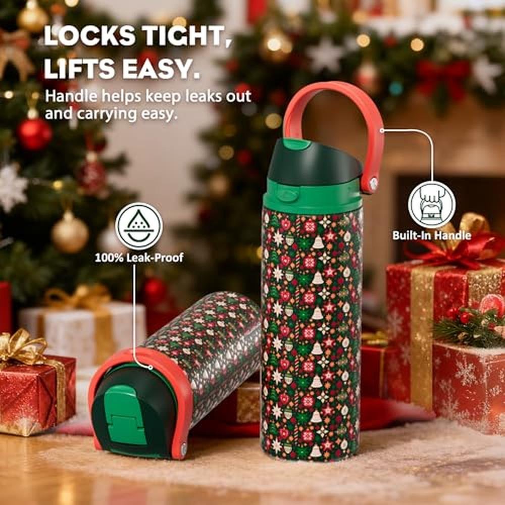 Water Bottle | POWCAN 24 oz Christmas Insulated Stainless Steel Water Bottle | 2-in-1 Push-Button Spout Leakproof