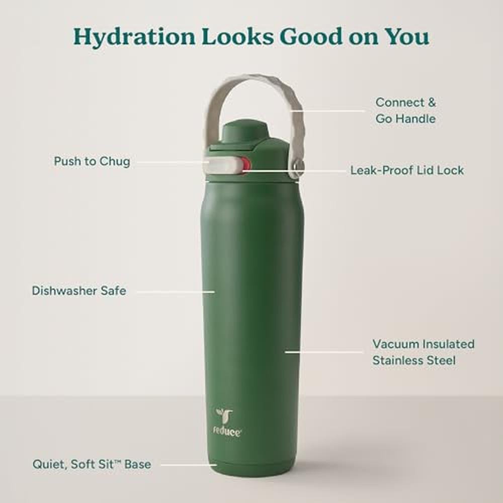 Designed with a convenient chug spout, this stainless steel water bottle ensures quick and efficient hydration during intense workouts. Its innovative leak-proof lock guarantees no spills, while the vacuum insulation keeps your drinks refreshingly cold for up to 30 hours, making it ideal for long travel or busy days at school or work. Engineered for versatility, the Aura's removable handle allows you to effortlessly attach and hang your bottle on gym equipment or backpacks, enhancing your mobile lifestyle. The Soft Sit(TM) base protects surfaces and minimizes noise, ensuring it rests softly on any surface without disturbing those around you. Perfect for mixing supplements or enjoying your favorite drink enhancers, this BPA-free thermal cup seamlessly fits into standard cupholders. Crafted for convenience, this dishwasher-safe water bottle simplifies cleaning after a long day. With its stylish and robust design, the Reduce Aura vacuum sealed water bottle excels as both a functional gym water bottle and a sophisticated travel accessory. Elevate your hydration experience and embrace a sustainable choice with Aura's remarkable blend of practicality and style. Ready to take on the day? Aura has you covered for every occasion.