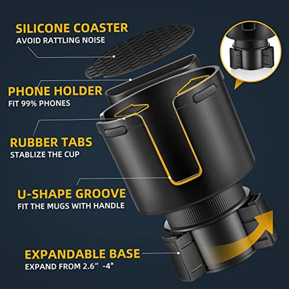 Experience the ultimate in vehicle storage with the TYKOR Car Cup Holder Expander, a premium car cup holder adapter designed to accommodate large water bottles and tumblers from renowned brands like YETI and HydroFlask. With its adjustable base, this car cup holder extender fits a wide range of bottle sizes, from 16-46 oz, and diameters between 2.7-4.2, making it the perfect solution for discerning drivers who want to keep their favorite beverages within easy reach. Whether you're looking for a sophisticated car cup holder to fit your daily commute or a high-performance car cup holder expander to maximize your vehicle's storage, the TYKOR Car Cup Holder Expander is the ideal choice. This 2-in-1 car cup holder expander can hold large bottles and phones simultaneously, saving valuable car space while keeping them securely in place. It can accommodate most large bottles and mugs from 2.6-4in, and the phone holder supports 99% of phones on the market.