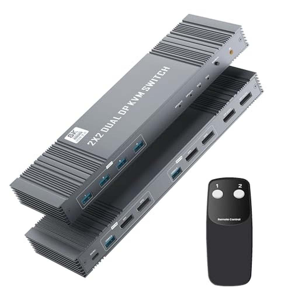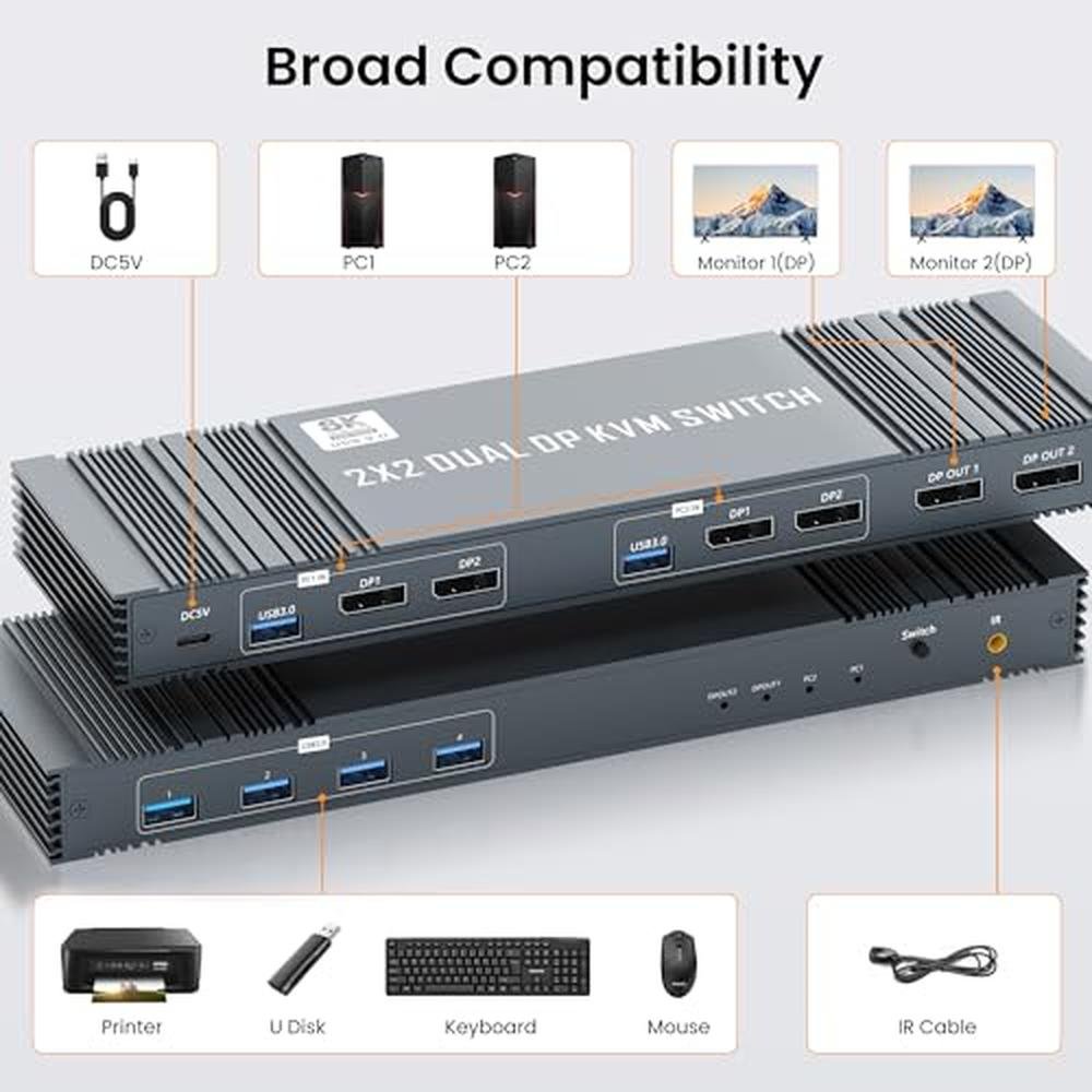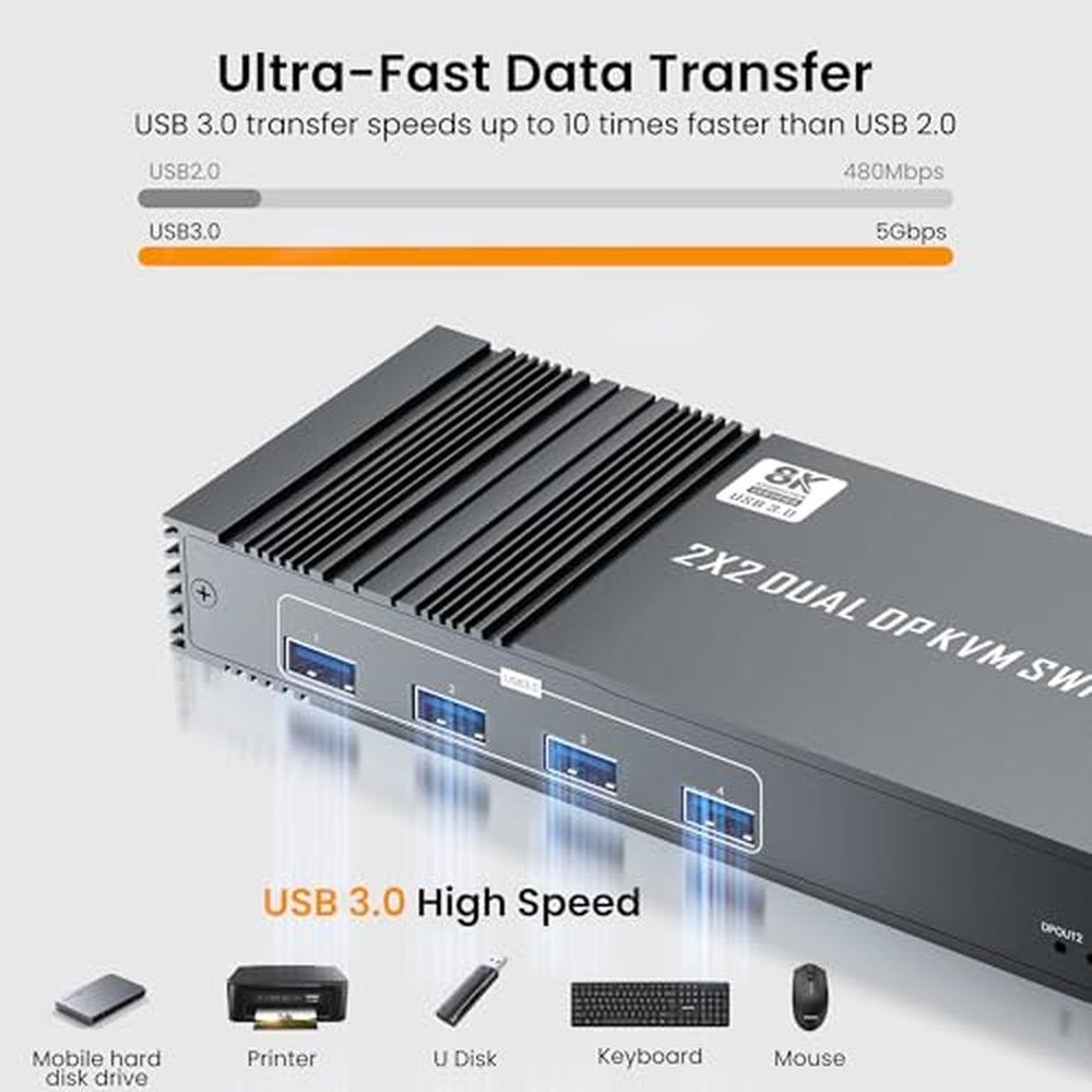 - DP KVM Switch Dual Monitor: 8K@60Hz KVM Switch 2 monitors for 2 computers DP 1.4 port devices with 4 USB 3.0 ports to share USB devices such as keyboard, mouse printer, USB flash drive, etc. The 2x2 DP KVM switcher supports extended and Copy modes.