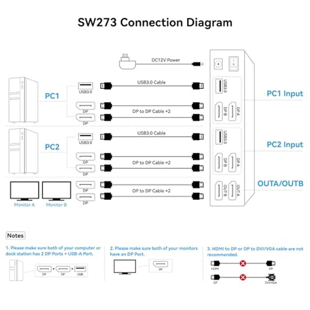 • Read Before Buying1. Each computer needs to be connected to the KVM switch via two DP cables instead of one; 2. In the entire setup, HDMI to DP or DP to HDMI conversion cables or adapters are not supported; 3. Both computers need to have two DP outputs, and each monitor needs at least one DP input; only when these three conditions are met can the switch function. Note: For compatibility reasons, it is not recommended to use a KVM switch with Mac devices