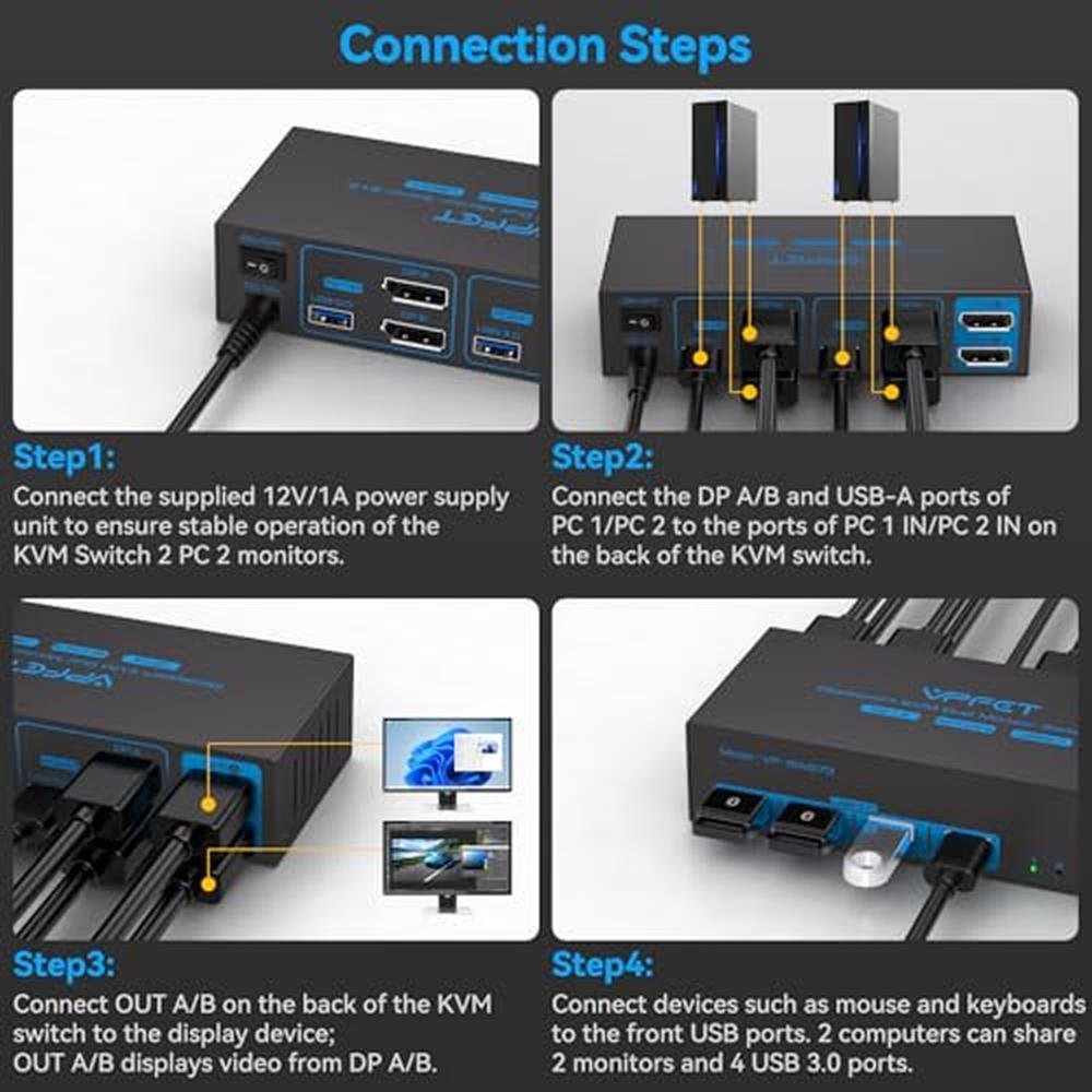 • Dual Monitor KVM Switch DisplayportDual Monitor KVM Switch DP 1.4 allows you to switch freely between 2 PCs or other signal source, and share 2 monitor and 4 USB devices. KVM switches support Extended&Copy Mode. If you need to use 2 monitors, requires your computer to have 2 DP ports. The DP A and DP B ports on the product must be connected to the same computer.