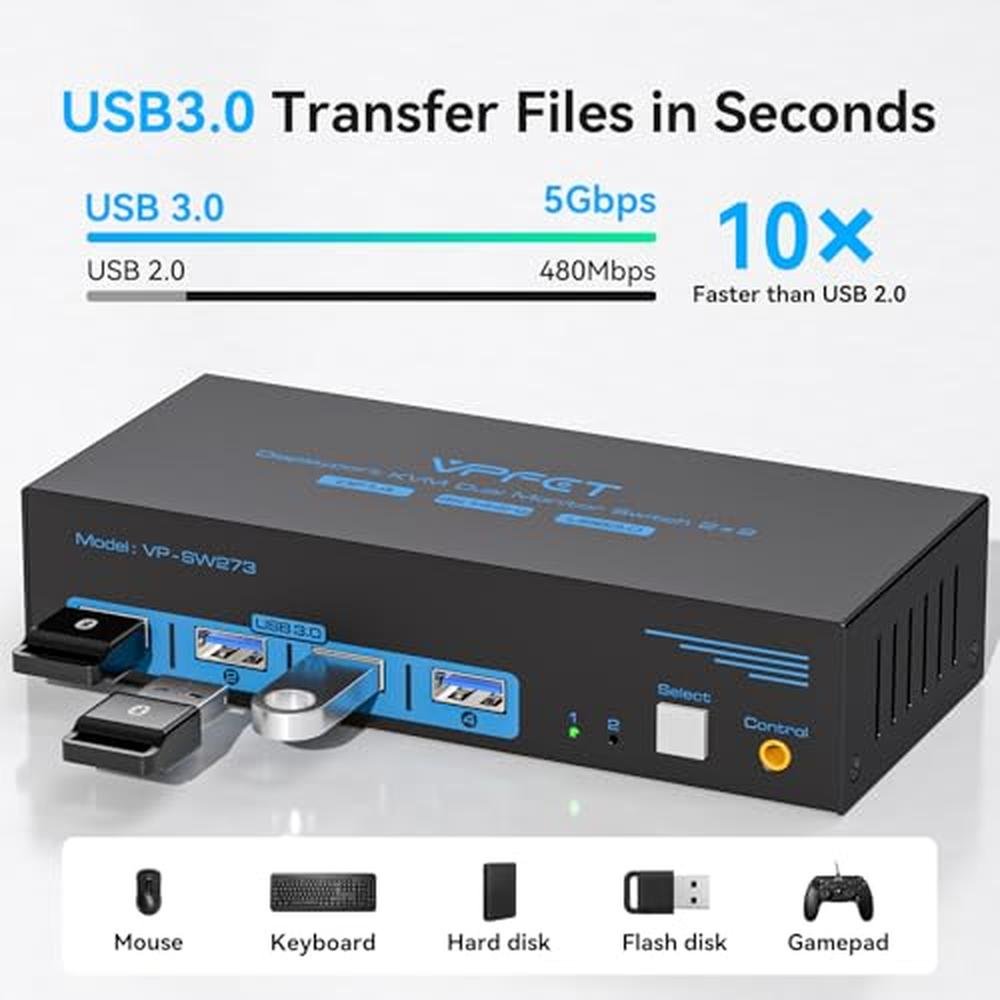 • Ultra HD 4K@144HzThe DP1.4 KVM Switches support max resolution up to 3840*2160@144Hz( 4K@144Hz) and is backward compatible with DP 1.2. Providing an incredible viewing experience with stunningly lifelike images and vibrant colors. Note: Final resolution is also subject to graphic cards, monitors, cables and adapters. Note: It is recommended to use 3.3ft length DP1.4 version cables for more stable operation and to avoid black screen splash screen.