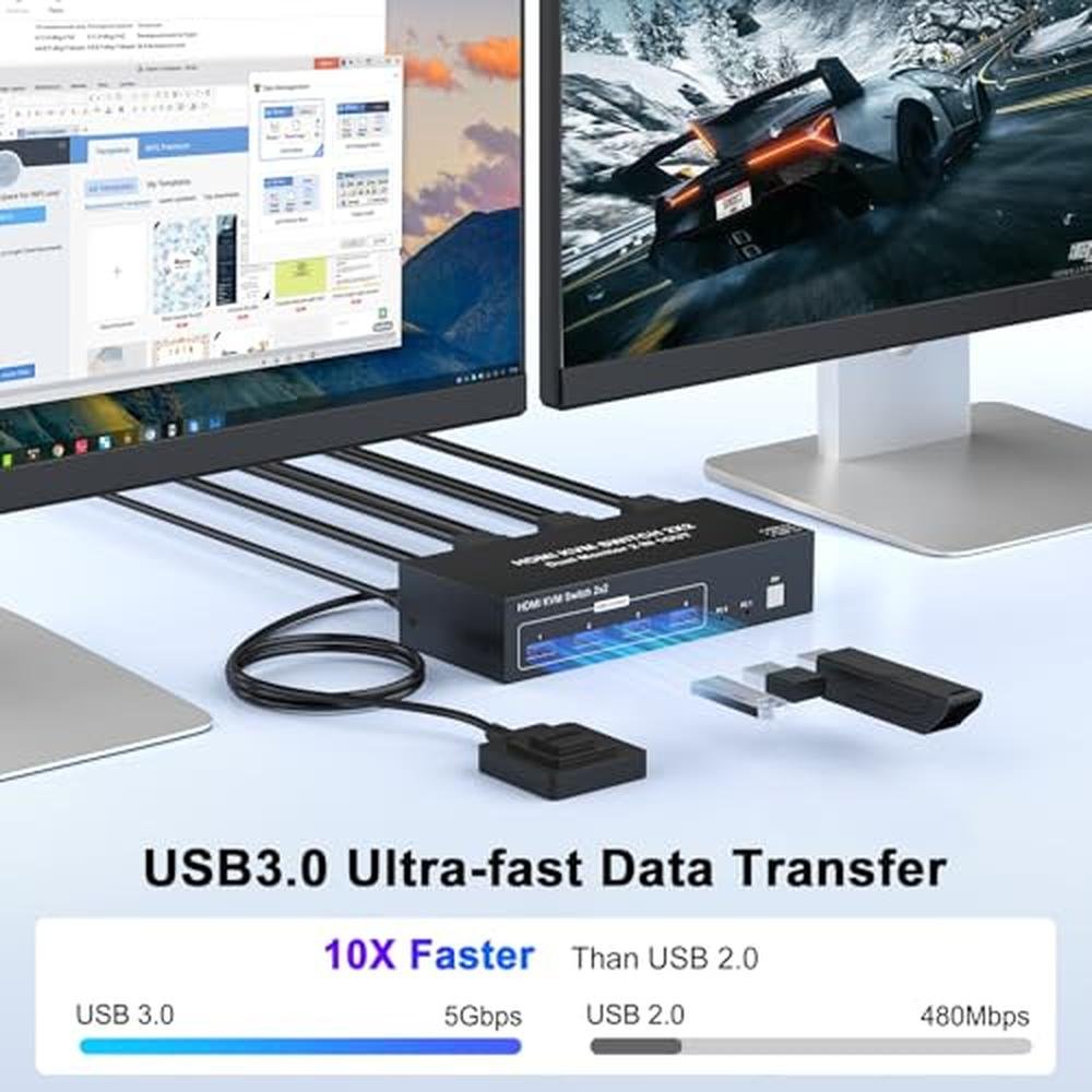 - KVM Switch with 4 USB 3.0 PortsDual monitors hdmi usb switcher with four high-speed USB 3.0 ports which can recognize wired/wireless keyboard mouse USB hard drive printer or other USB devices.please note that this KVM switch not compatible with HD Webcam and macbook pro well,so we don't recomand connect to our product