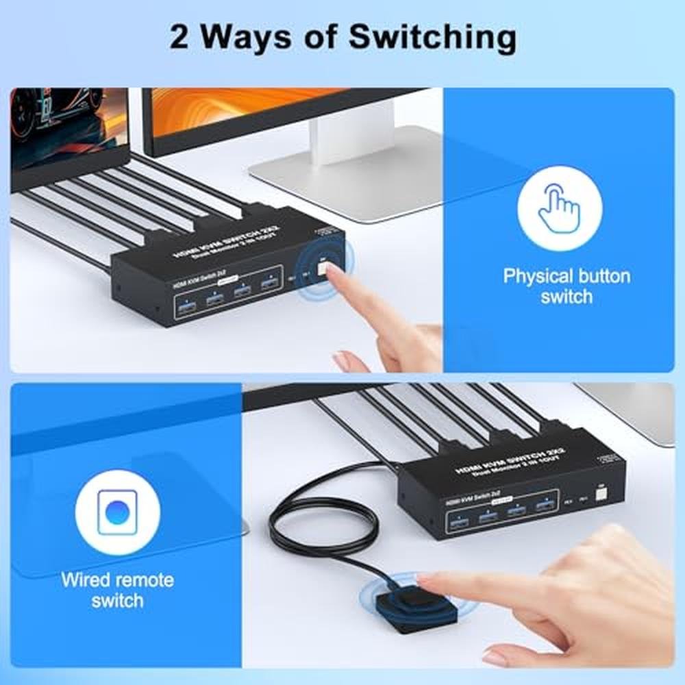 - Displayport HDMI KVM Switch Dual Monitors This dual monitor KVM switch allows seamless control of 2 computers while sharing 2 monitors and 4 USB 3.0 devices along with a single keyboard and mouse. It supports flexible switching between extended mode (displaying different content on dual screens) and mirror mode (duplicating identical content).Please note that the extended mode can output two different screens, and the copy mode can output two identical screens