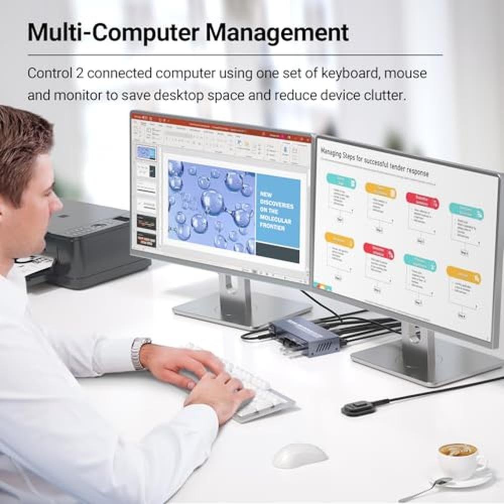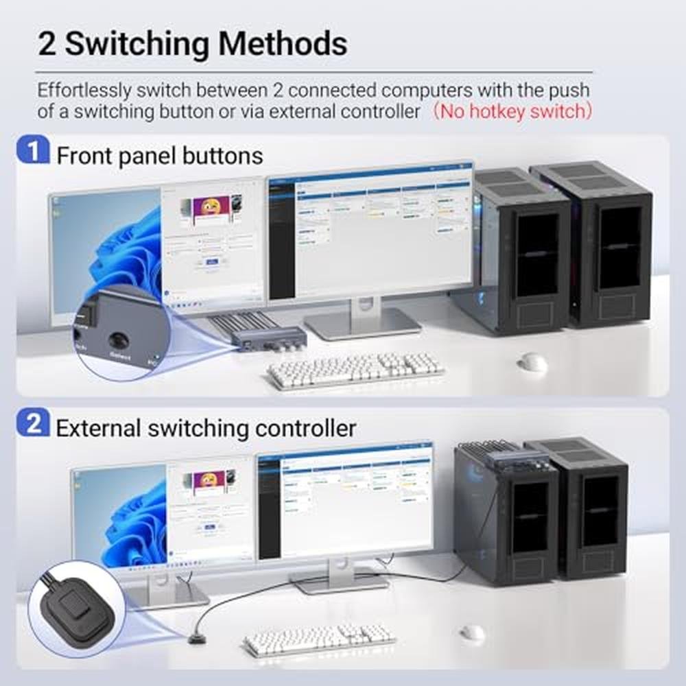 - Convenient Switching: Easily switch between 2 computers with the push button on the KVM switch or through the external switching controller, ensuring smooth transitions. Note: Hotkey switching is NOT supported.