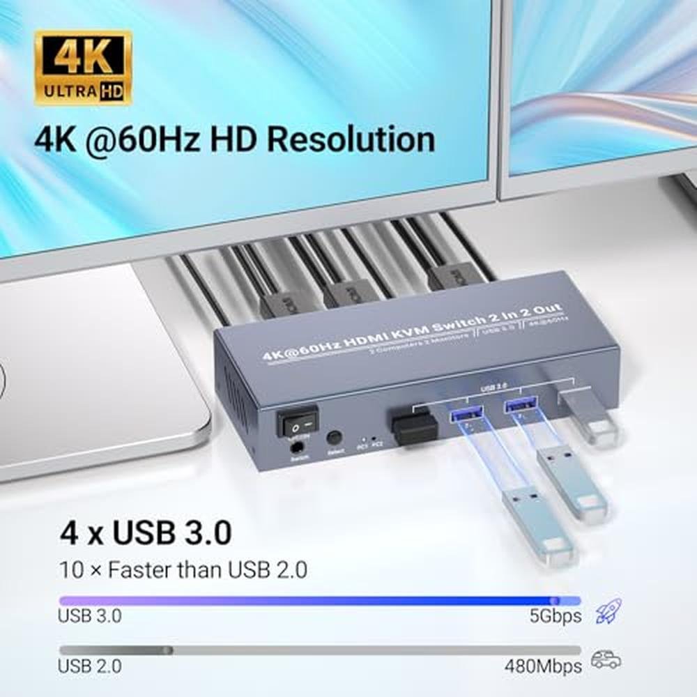 4K/60Hz HDMI KVM Switch 2 In 2 Out This 4K dual monitor HDMI KVM Switch is an ideal solution for professionals, gamers, and anyone who needs to manage and control 2 computers with ease and efficiency. Experience the convenience of controlling multiple computers with a single set of peripherals(keyboard, mouse), all while enjoying exceptional 4K video quality. Effortlessly manage 2 computers with the 4K HDMI KVM Switch 2 monitors 2 computers, designed for easy control of two computers using one set of keyboard, mouse, and 2 displays. Plug-and-Play Simple setup with no need for drivers or software, making it easy to get started right out of the box.